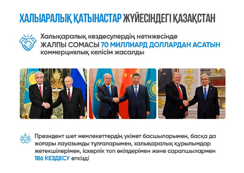 Бұл кездесулер Қазақстанның аймақтық серіктестерімен және жаһандық державалармен көпвекторлы байланысын нығайтуға бағытталды. Нәтижесінде халықаралық ынтымақтастық күн тәртібіндегі басым бағыттардың бірі болып қала береді.