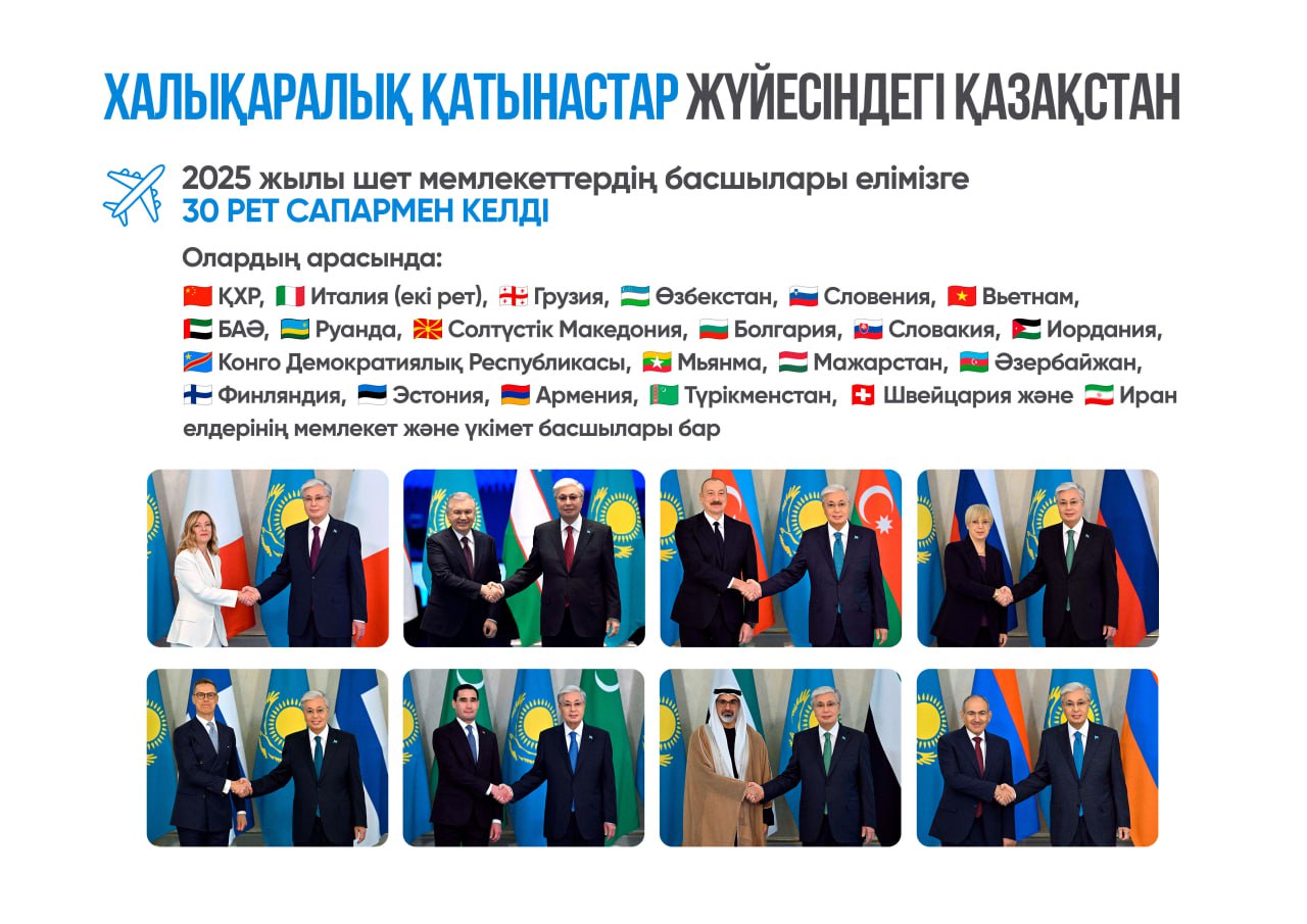 2025 жылы шет мемлекеттердің басшылары Қазақстанға 30 рет cапармен келді.